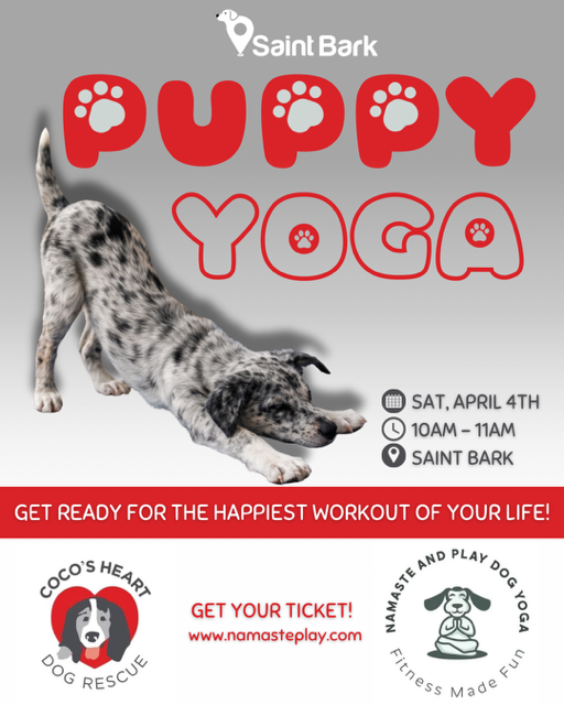 What to Bring: Your yoga mat/towel, a water bottle, and wear comfy clothes. Bring a new dog toy, bag of dog treats/food, potty pads or a cash donation and get your name entered into a drawing to win a free puppy/dog yoga class ticket for a class in May 2026. The winner will be contacted at the end of April. Come for the yoga, stay for the puppy/dog love!