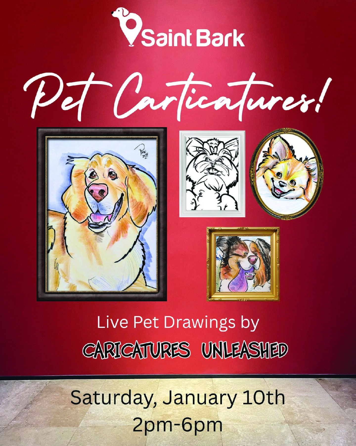 You can text him pictures of your Dogs ahead of time, and he can have your drawings ready for pickup at Saint Bark on the 10th. You can send pictures and your information to 515-809-0142.